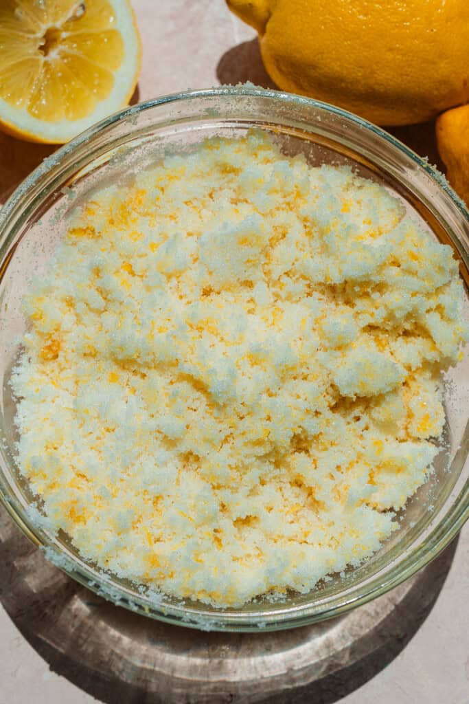 Step 1: Make Lemon Zested Sugar. Zest your lemons and rub the zest into granulated sugar with clean hands to release the lemon flavor.