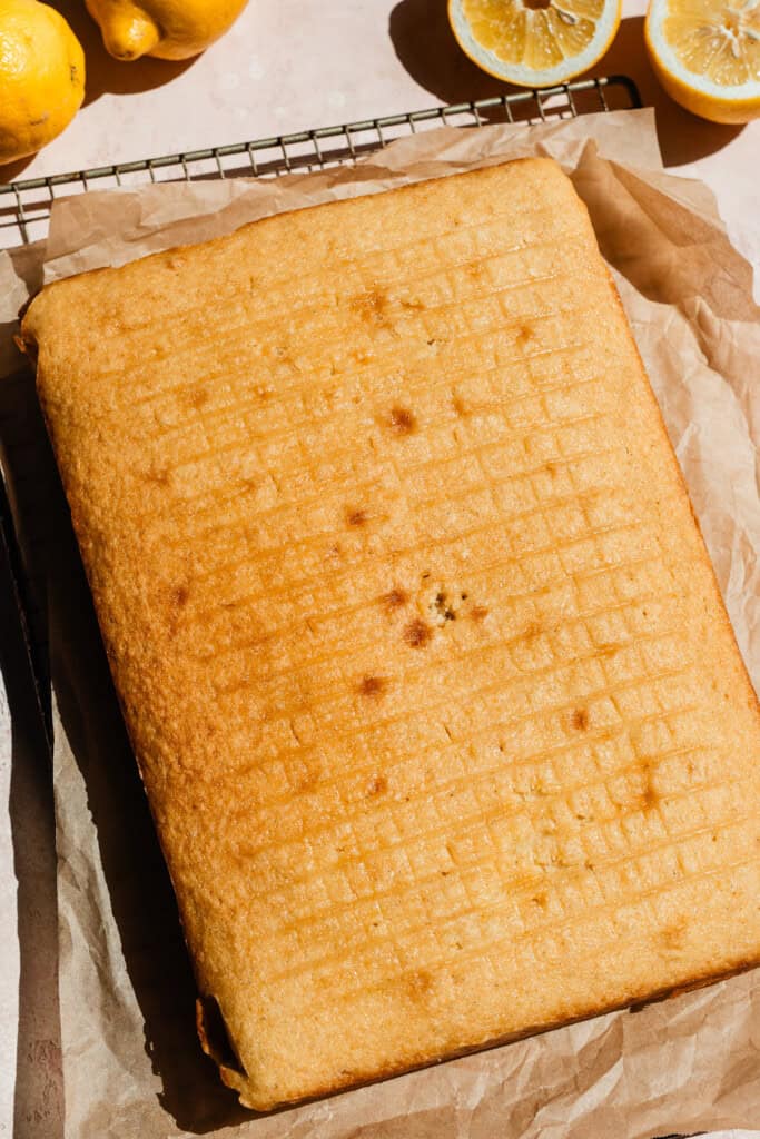 Step 3: Bake. Spread the batter evenly in a 9×13 pan and bake as directed in the recipe card below. Allow to cool while you make the frosting.