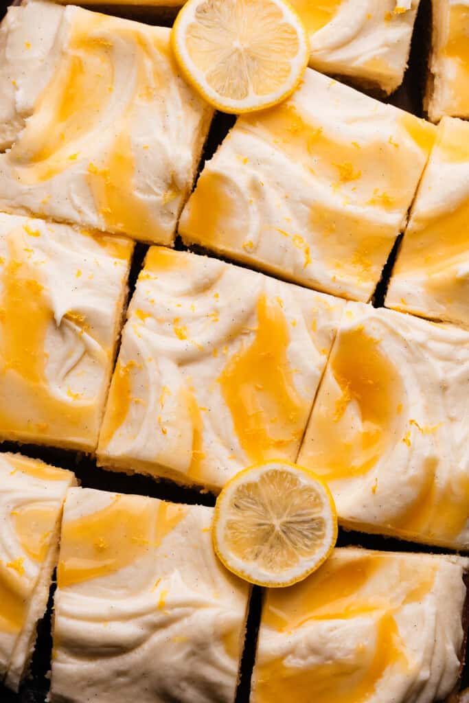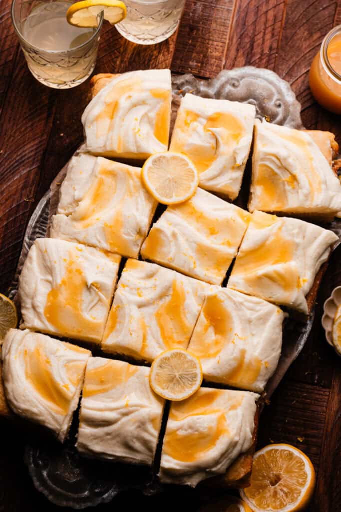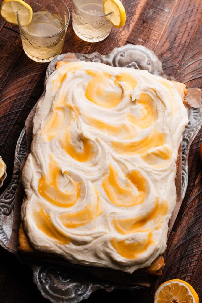 - Make the Frosting: In a large mixing bowl or in the bowl of a stand mixer fitted with the paddle attachment, beat the butter until creamy, about 60 seconds. Mix in the powdered sugar in a few additions, using heavy cream as needed to help it combine. Mix in the lemon juice, vanilla, and salt. Beat in the mascarpone last, until just combined. Spread frosting over the cooled cake with an offset spatula, then dollop lemon curd randomly all over the frosting. Swirl the lemon curd into the frosting with the back of a spoon. Add lemon slices for garnish, if desired.1 and 1/2 cups salted butter, softened at room temperature , 5 cups powdered sugar , 1/4 cup heavy cream, 4-6 tbsp freshly squeezed lemon juice, 1 tbsp vanilla extract , pinch of salt, 1/3 cup mascarpone, at room temperature