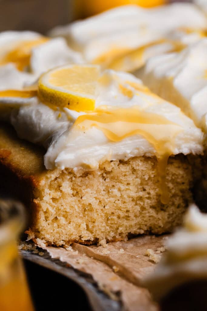 - Start the Cake Batter: Zest your lemons. In a small to medium bowl, rub the lemon zest into the granulated sugar with clean hands, until you have a sandy mixture. This brings out the lemon flavor!Beat the softened butter in a large bowl with an electric mixer on high speed for about 30 seconds, until creamed. Add the lemon zested sugar and brown sugar and beat on high for 2 minutes. Add two eggs and beat on medium speed with for about 30 seconds or so, until combined. Repeat with the third egg. Mix in the oil until just combined. Add the vanilla and water and mix on medium until just combined. The batter may a look a bit split at this point – that's completely normal and it will be fine, don't fret! Mix in the sour cream on medium until just combined.1 and 1/2 cups granulated sugar, 3/4 cup salted butter, softened at room temperature , 1/4 cup light brown sugar, packed, 3 large eggs, at room temperature , 2 tsp vanilla extract, 1 tbsp + 1 tsp vegetable oil, 2 tbsp warm water, 3/4 cup full-fat sour cream, at room temperature, 3 large lemons, zested